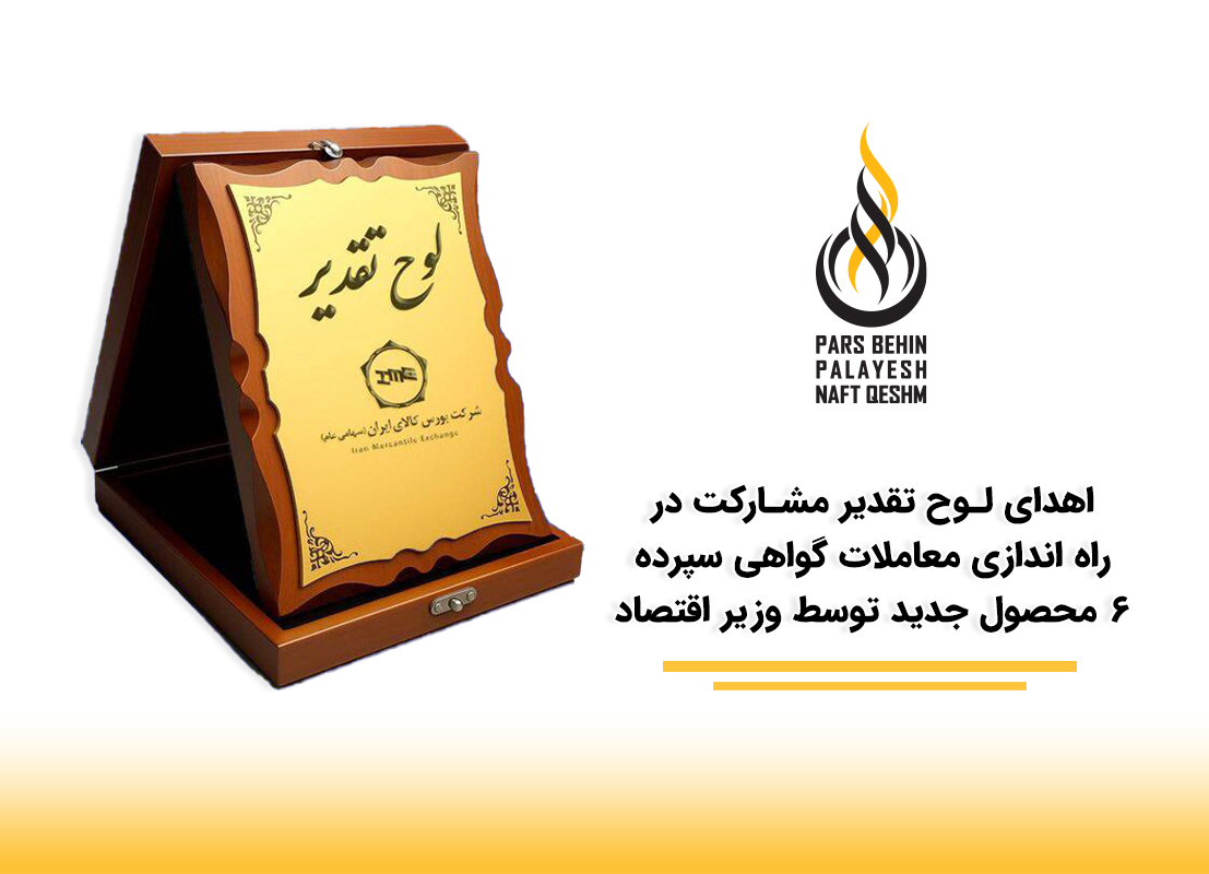 شرکت پارس بهین پالایش نفت قشم، از شرکتهای زیرمجموعه گروه انرژی پاسارگاد، به پاس مشارکت مؤثر در توسعه بازار مالی بورس کالا و نقشآفرینی در راهاندازی معاملات گواهی سپرده کالایی قیر، از سوی وزیر امور اقتصادی و دارایی مورد تقدیر قرار گرفت و لوح سپاس دریافت کرد.