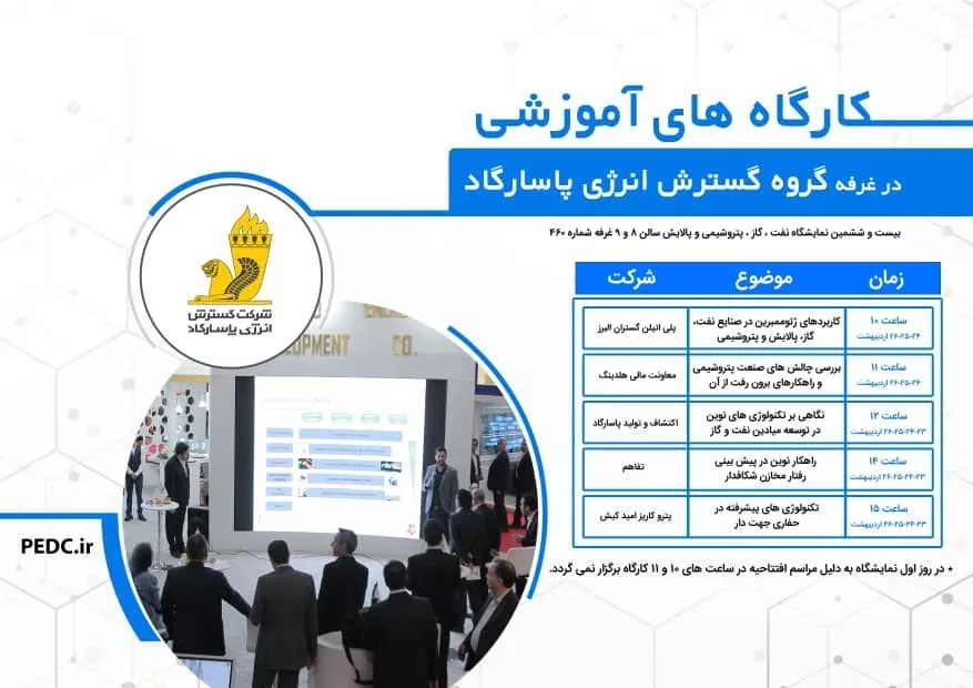 همزمان با برپایی بیست و ششمین نمایشگاه نفت، گاز، پالایش و پتروشیمی، کارگاه های تخصصی حوزه انرژی از تاریخ 23 الی 26 اردیبهشت ماه 1401 در غرفه گروه گسترش انرژی پاسارگاد برگزار می گردد.