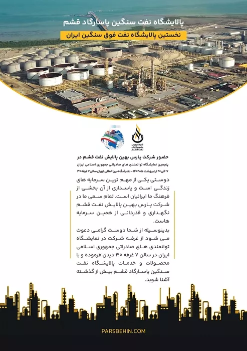 شرکت پارس بهین پالایش نفت قشم پاسارگاد در سالن شماره ۷ نمایشگاه بینالمللی تهران، غرفه ۳۰، آماده پذیرفتن بازدیدکنندگان و ذینفعان این صنعت خواهد بود.