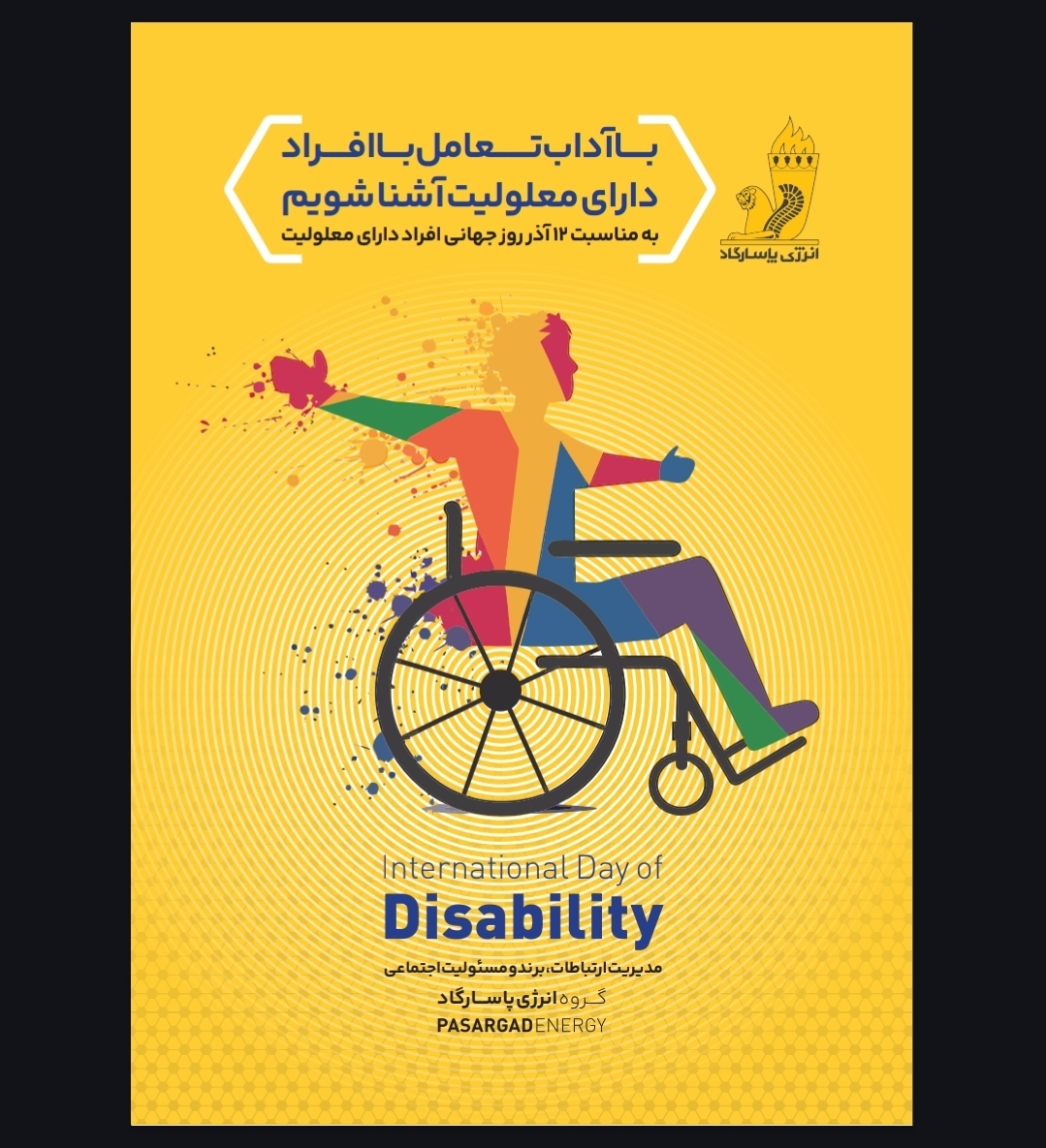 پاسداشت روز ۱۲ آذر مصادف با ۳ دسامبر، بهانه ای برای بالا بردن آگاهی جامعه در رابطه با نیازها و حقوق افراد دارای معلولیت و حمایت بیشتر از حضور این افراد در جامعه است؛ گروه انرژی پاسارگاد در چارچوب مسئولیتهای اجتماعی خود در قبال ارتقای آگاهی همکاران گرامی درباره افراد دارای معلولیت، فرهنگسازی در این حوزه را در دستور کار قرار داده است.
